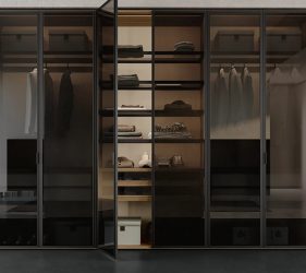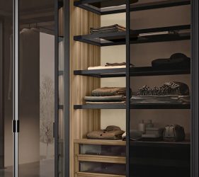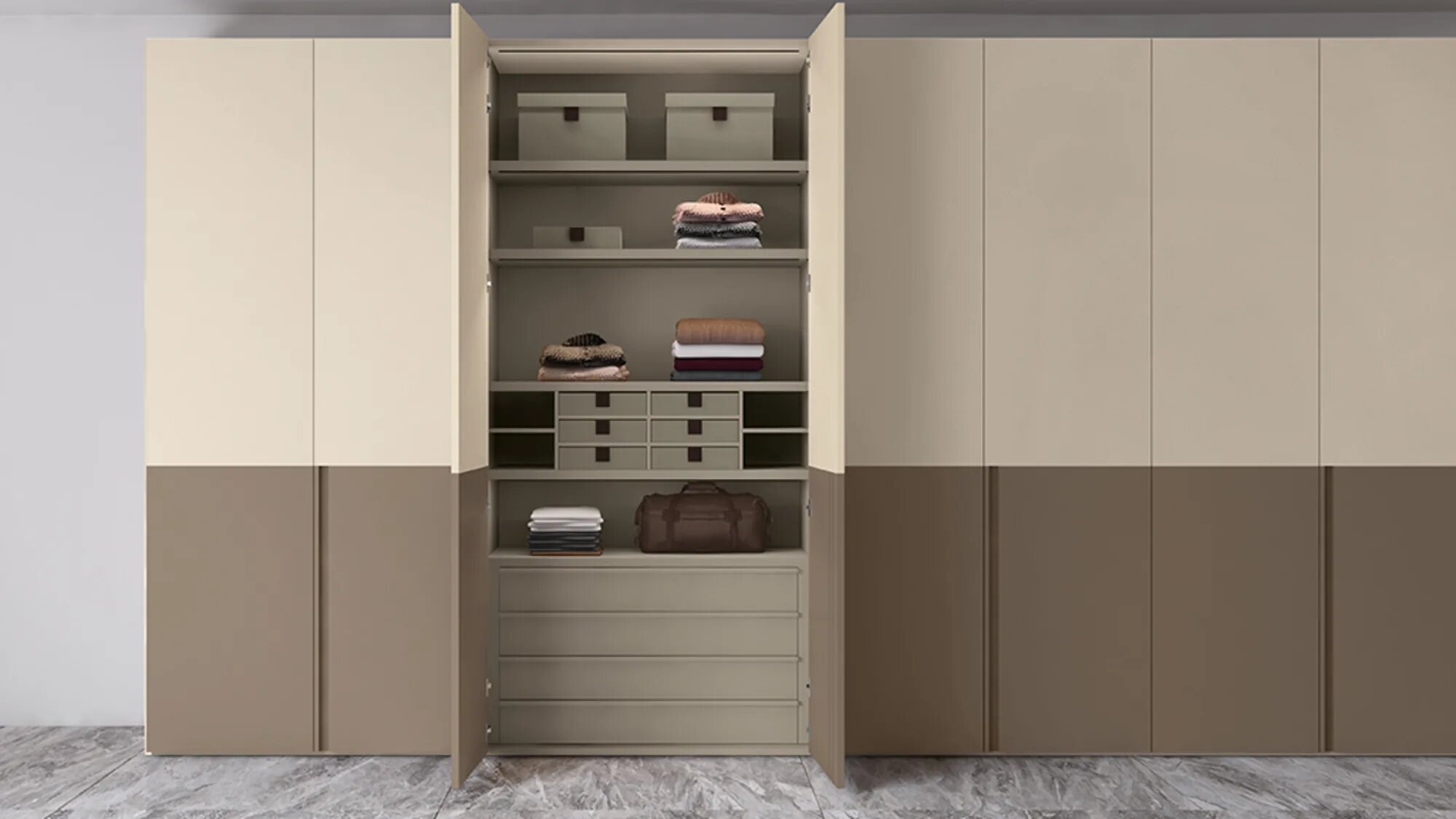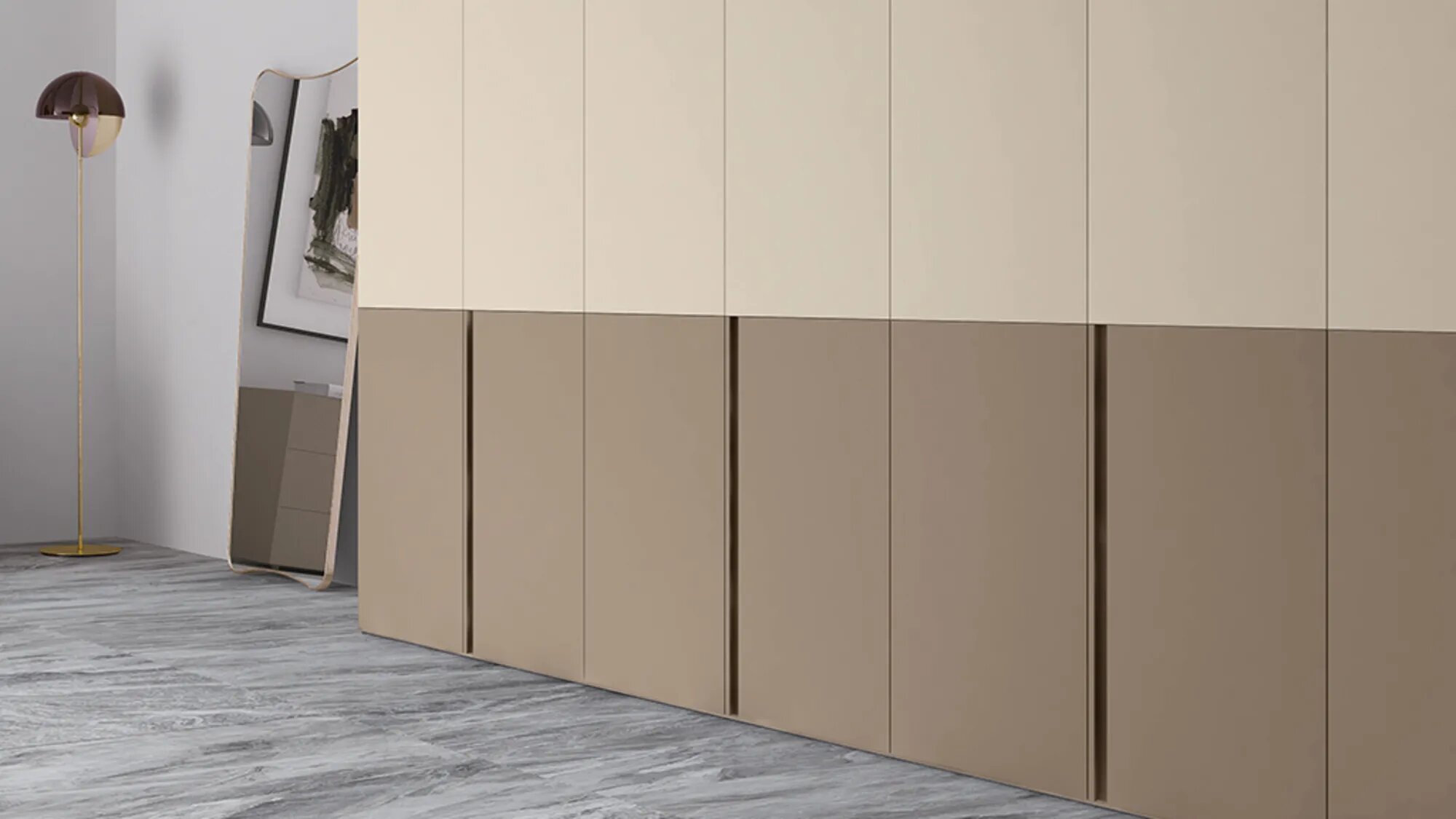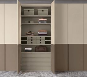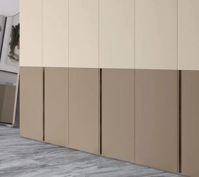 Anta battente LeWitt in laccato opaco avorio e visone, maniglia gola in laccato opaco visone. La maniglia gola può essere personalizzata in tutta la gamma dei colori laccati opaco con interno in tinta. A scelta, inserto interno in tutta la gamma dei colori nobilitati.